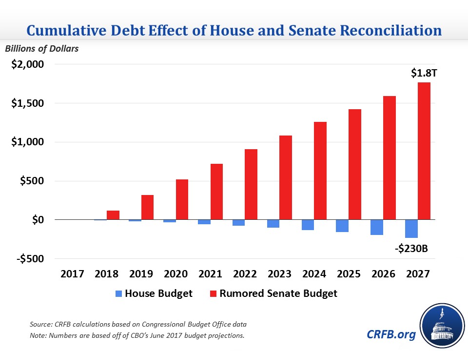 With the important caveat that the House and Senate rely on different scoring methods, a comparison of the two shows the rumored Senate instructions would be as much as $2 trillion worse for the debt than the House ones.
