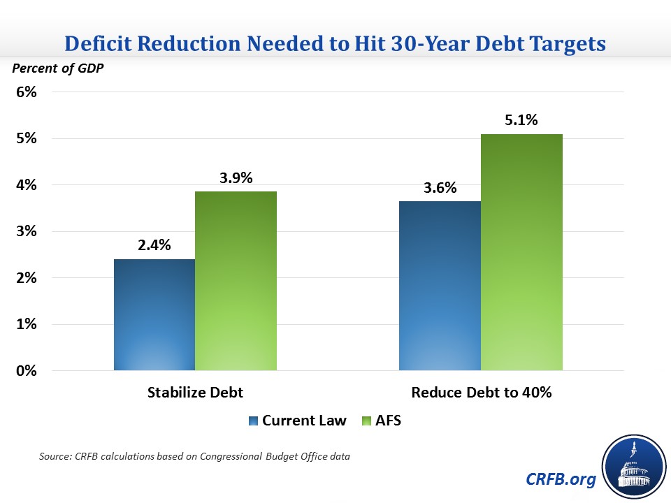 One way to quantify the country's long-term fiscal situation is by measuring its fiscal gap, or the amount of non-interest deficit reduction needed each year to achieve a given fiscal target. Under current law, stabilizing the debt at its current post-World War II record level of 77 percent of GDP would require deficit reduction of 2.4 percent of GDP per year over three decades (the equivalent of $6.1 trillion over ten years). Reducing debt to its historical average of 40 percent of GDP would require 3.6 percent of GDP (the equivalent of $9.2 trillion). Under the AFS, there would be a much higher fiscal gap of 3.9 percent of GDP (the equivalent of $9.7 trillion over ten years) for stabilizing the debt and 5.1 percent ($12.9 trillion) for reducing it to 40 percent of GDP.