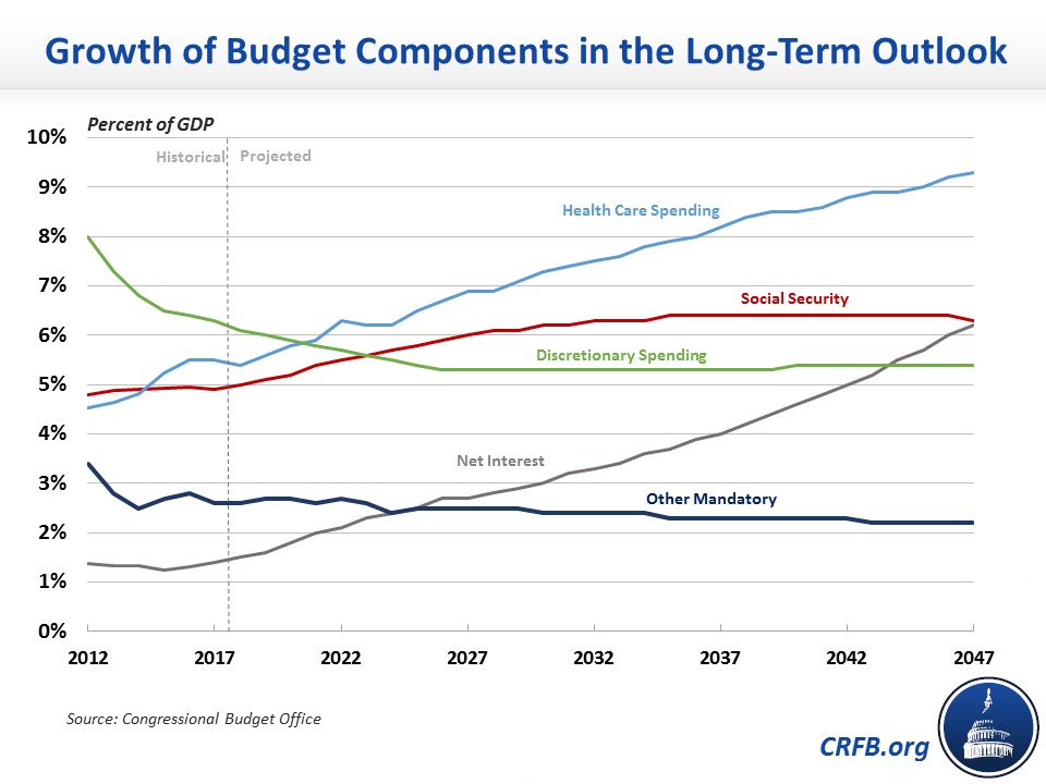 The Congressional Budget Office’s (CBO) latest Long-Term Budget Outlook projects that federal debt held by the public will exceed the size of the economy by 2033 and reach 150 percent of Gross Domestic Product (GDP) by 2047. This dramatic growth in debt is the result of large and growing deficits. With an aging population, rising interest rates, and growing health care costs, federal spending will increase much faster than revenue.