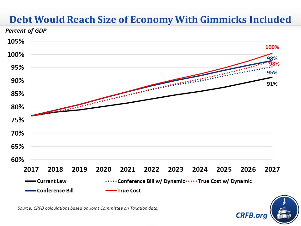 The final conference committee agreement of the Tax Cuts and Jobs Act (TCJA) would cost $1.46 trillion under conventional scoring and over $1 trillion on a dynamic basis over ten years, leading debt to rise to between 95 percent and 98 percent of Gross Domestic Product (GDP) by 2027 (compared to 91 percent under current law). However, the bill also includes a number of expirations and long-delayed tax hikes meant to reduce the official cost of the bill. These expirations and delays hide $570 billion to $725 billion of potential further costs, which could ultimately increase the cost of the bill to $2.0 trillion to $2.2 trillion (before interest) on a conventional basis or roughly $1.5 trillion to $1.7 trillion on a dynamic basis over a decade. As a result, debt would rise to between 98 percent and 100 percent of GDP by 2027.