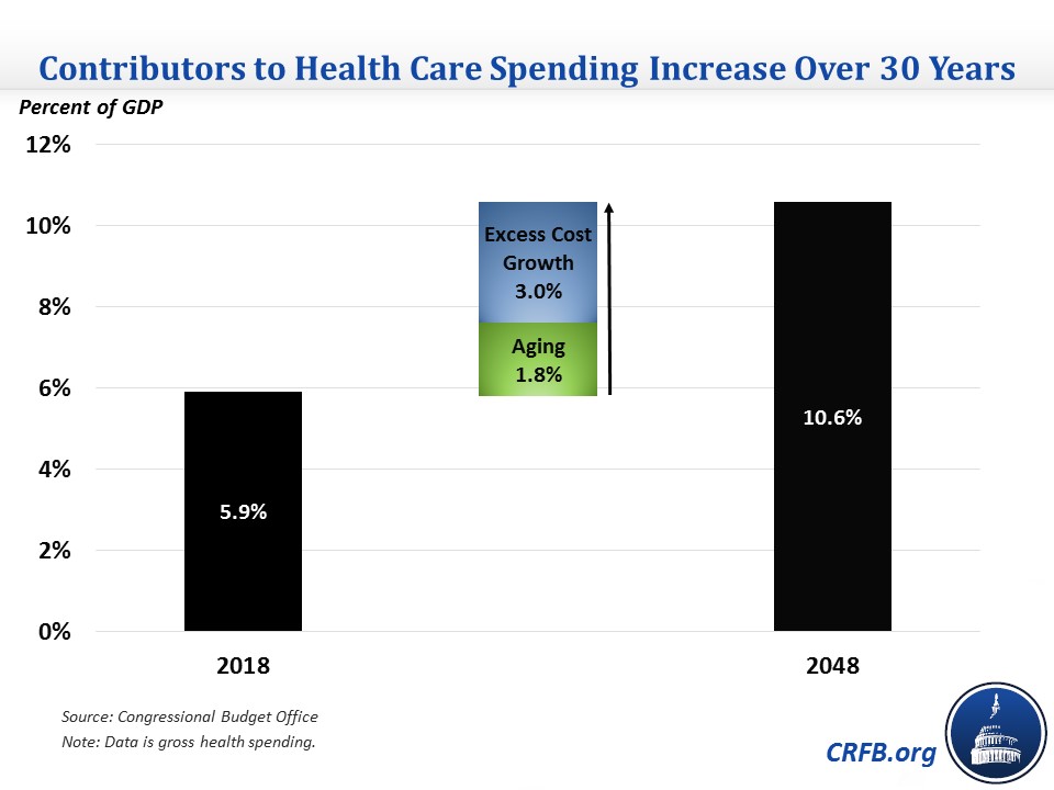 This growth in health spending is due to aging of the population and cost growth exceeding GDP growth. CBO estimates that gross health spending is 4.8 percent of GDP higher in 2048 than it would be in absence of aging or excess cost growth, with aging contributing 1.8 percent and cost growth contributing 3 percent. The aging of the population can be seen in CBO's projection that the 65 and older population will increase by 60 percent, from 53 to 85 million, over the next 30 years, while CBO's excess cost growth projections show both Medicare and the other programs having excess cost growth of at least 1 percent per year between 2029 and 2048.