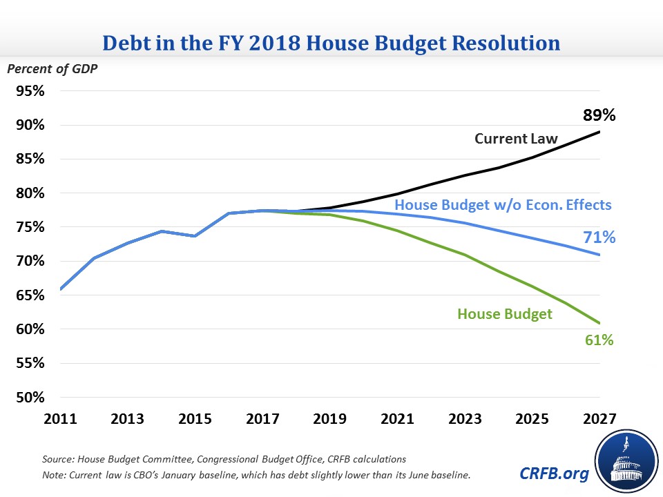 Based on the numbers provided by the Budget Committee, the budget would put the debt on a clear downward path, falling from 77 percent of GDP in 2017 to 61 percent by 2027. Excluding the budget's presumed increase in economic growth, which results in the economy in 2027 being 8 percent larger than the Congressional Budget Office (CBO) projects, debt would decline more gradually to 71 percent. Both results are much better than CBO's January projection for current law, which has debt reaching 89 percent of GDP by 2027 (CBO's June update projects debt rising to 91 percent of GDP under current law.)