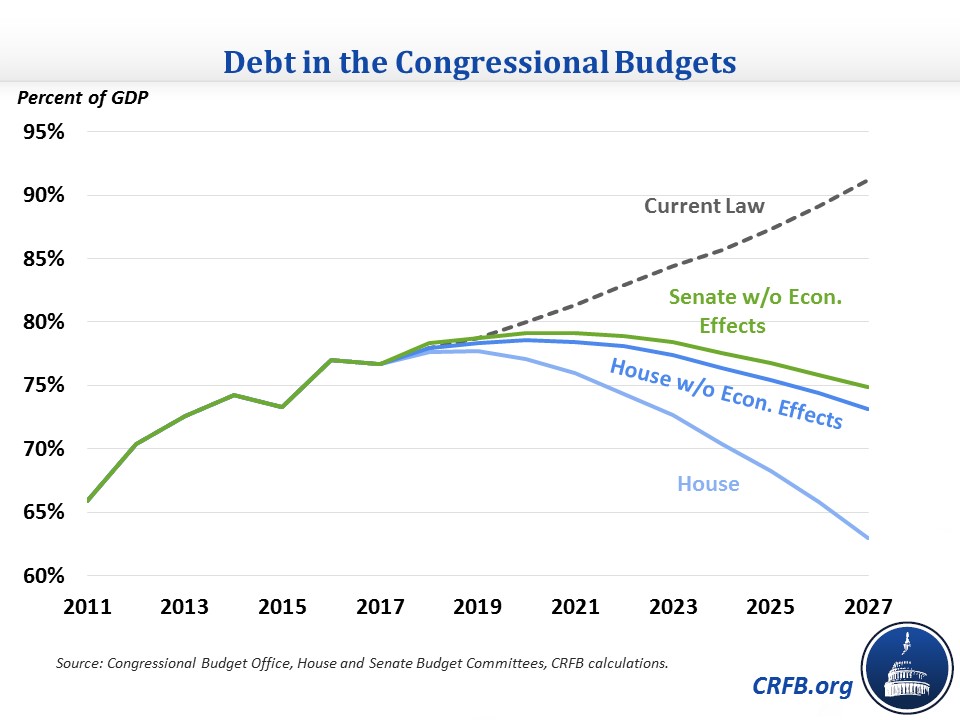 Both budget resolutions would improve the debt outlook, but to different degrees. The House budget assumes savings and increases in economic growth that would reduce debt from its current level of 77 percent of GDP to 63 percent by 2027; ignoring economic effects, debt would fall more gradually to 73 percent in 2027*. Meanwhile, the Senate budget would result in debt increasing to a peak of 79 percent of GDP by 2020 before declining to 75 percent by 2027. This estimate ignores the budget's claimed economic growth effects; it is difficult to determine what debt would be when counting economic effects based on the information given.
