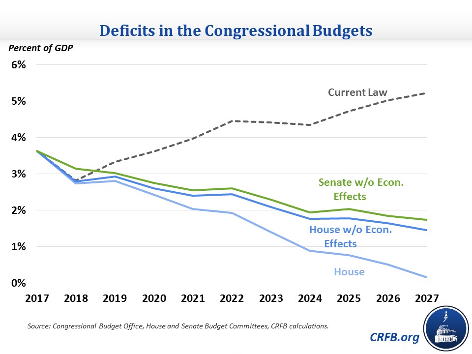 Instead of deficits rising significantly over the next decade as expected in current law, both budgets would reduce deficits as a share of GDP. Under the House budget, the deficit would fall from 3.6 percent of GDP in 2017 to 0.2 percent, or about $40 billion, by 2027. Ignoring economic growth, the deficit would be higher but still relatively modest at 1.4 percent, or about $400 billion. Meanwhile, the Senate would not balance in 2027 since it only aims for on-budget balance, instead leaving a deficit of 1.7 percent of GDP ($485 billion) ignoring economic effects. Again, it is difficult to determine what the deficit would be if economic effects were included.