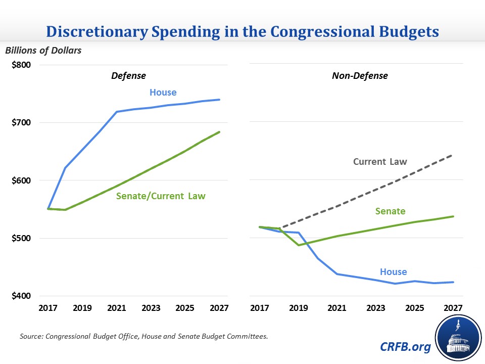 In contrast, the Senate adheres to the current law spending cap for both defense and non-defense for FY 2018, allowing spending levels to be increased to reflect increase in cap for defense spending. It sticks to current law levels for defense in the following years as well. For non-defense, it includes a deeper non-defense budget authority than the House in FY 2019 ($42 billion), but since it allows the category to grow every year after that, its ten-year non-defense cuts are only about half as large as the House's at $632 billion. Still, these are steep cuts that lawmakers may ultimately find difficult to adhere to.