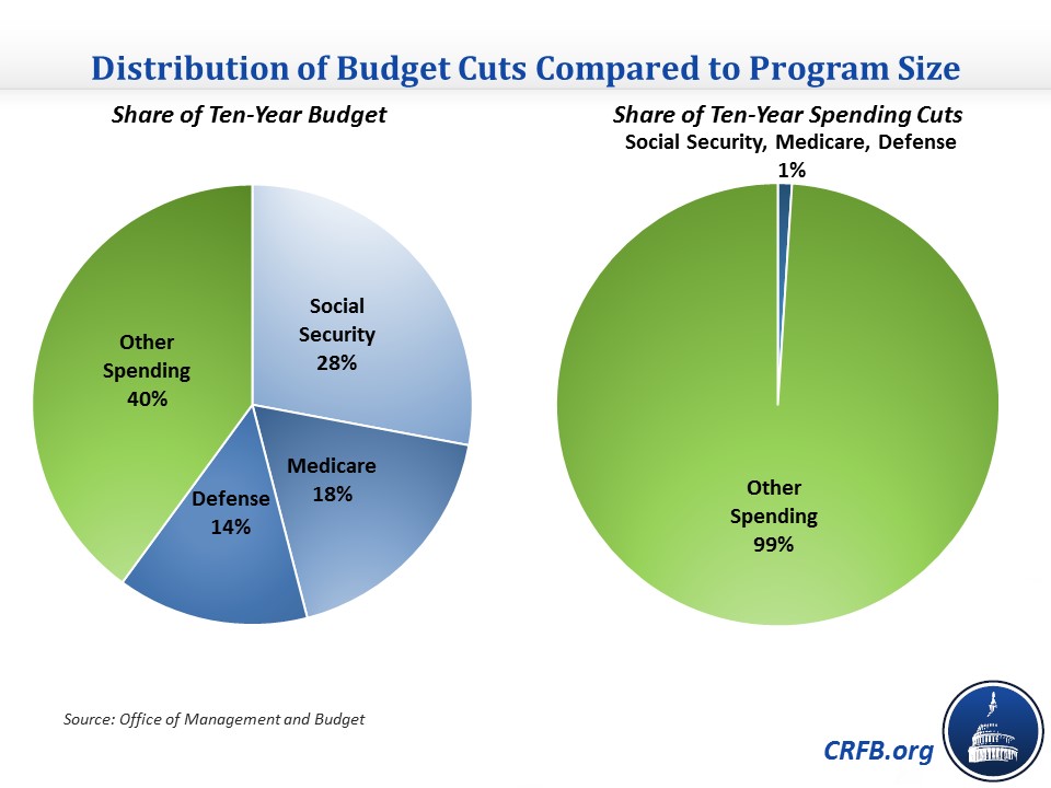 Another way to look at it is that the budget largely exempts Social Security, Medicare, and defense from cuts, getting only 1 percent of the total from programs that make up 60 percent of the budget. Meanwhile, essentially all of the spending cuts come from the remaining 40 percent of the budget.