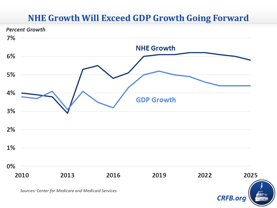 Overall, health spending will grow as a share of the economy over the next decade as it has in the past, albeit at slightly lower rates. This excess cost growth is part of the reason that the Congressional Budget Office forecasts continuously growing health care spending as a share of GDP over the long term, a major factor in growing debt. CMS's projections show that while the health spending outlook is a little bit more favorable than it has been historically, lawmakers still have work to do to get it under control.