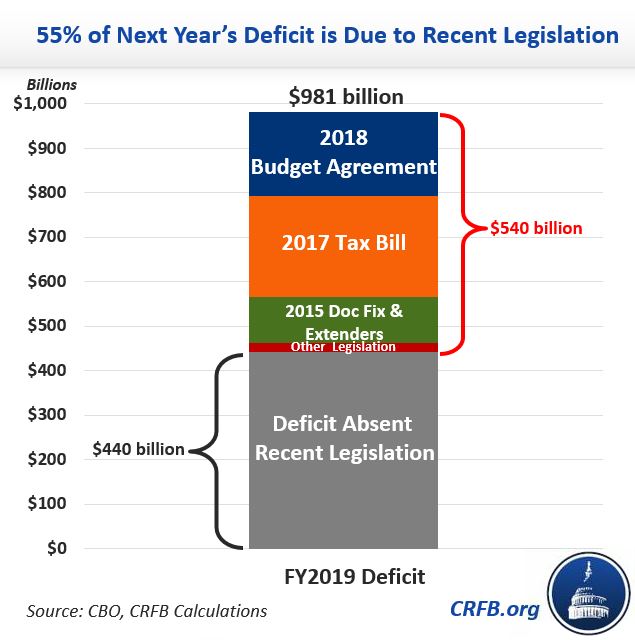 The budget deficit will approach the trillion-dollar mark next year, according to recent projections from the Congressional Budget Office (CBO). Well over half of that deficit, by our estimates, is the result of legislation passed since 2015 and signed by Presidents Trump and Obama.