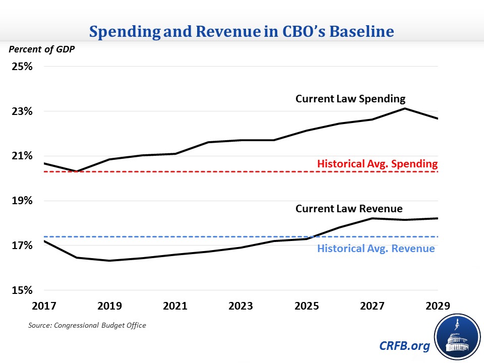 Growing deficits and debt reflect a continued disconnect between spending and revenue. Next year, spending will be 0.7 percentage points above its historical average of 20.3 percent of GDP, while revenue will be 1 percentage point below its historical average of 17.4 percent. Spending will grow to 22.7 percent of GDP by 2029, while revenue will grow to 18.2 percent, mostly due to the expiration of large parts of the 2017 tax law (revenue would be 17.3 percent of GDP in 2025 just before the expirations).