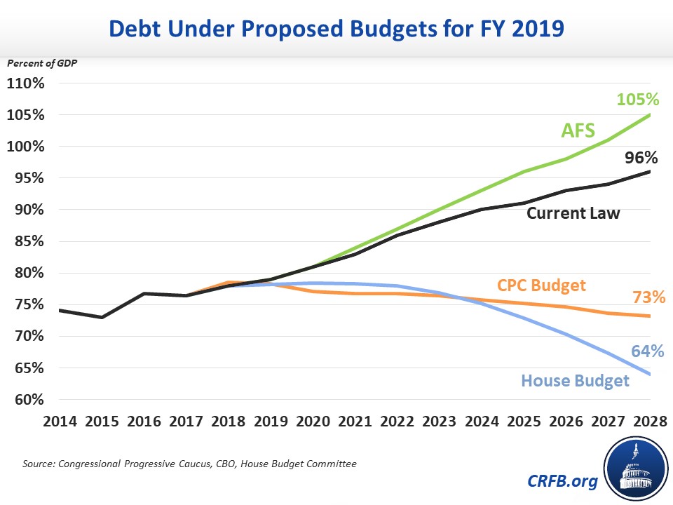 Under the CPC’s budget, debt would decline as a share of the economy from 78 percent of Gross Domestic Product (GDP) today to 73 percent by 2028, rather than rising to 96 percent under current law. This is lower than where debt was headed in CPC’s proposal last year (over 75 percent of GDP) but higher than where debt would end up under the blueprint approved by the House Budget Committee (64 percent of GDP).