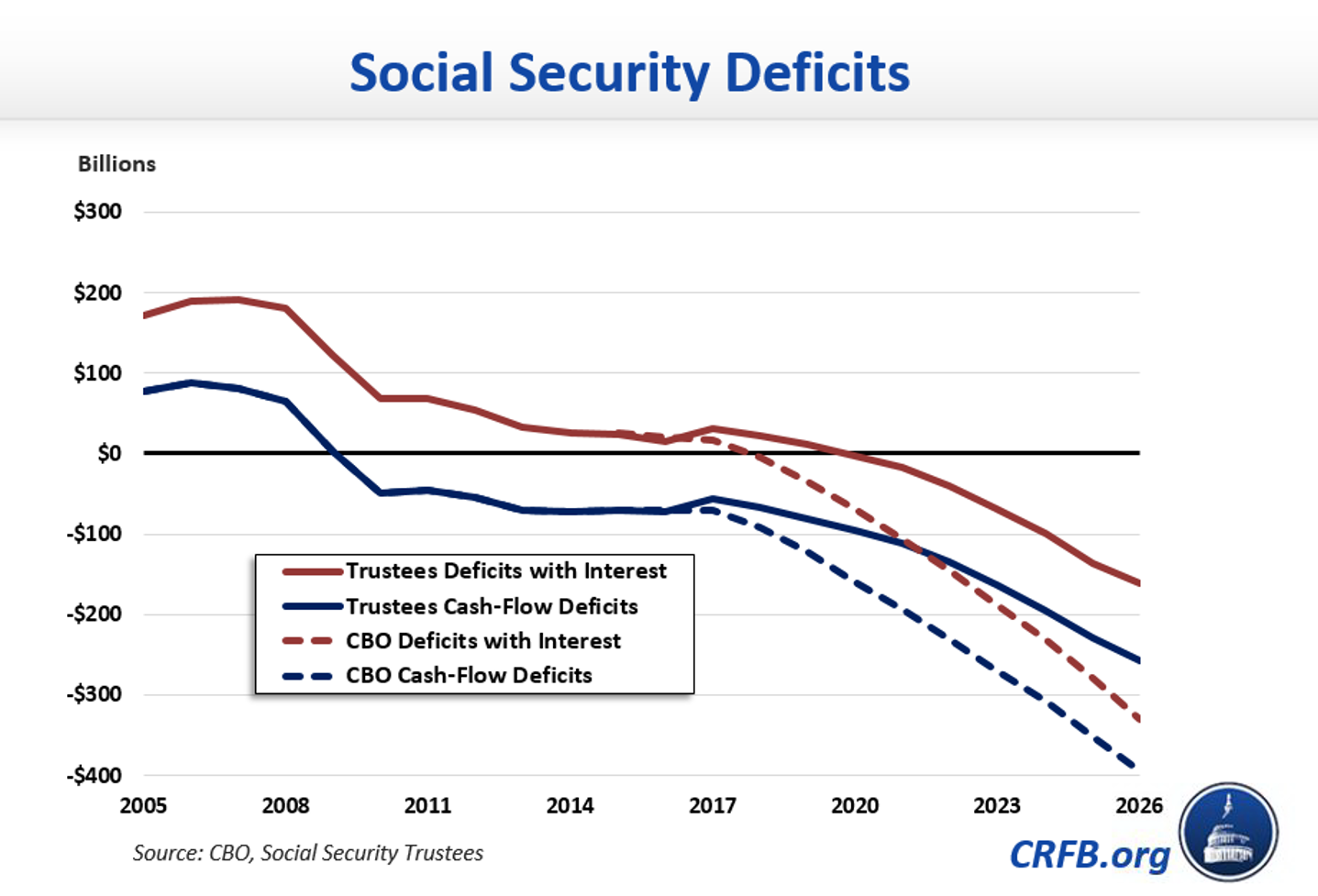 According to the Trustees, Social Security will begin running deficits including interest in 2020; according to CBO this will occur by FY2018. By 2026, the program will be running an interest-inclusive deficit of $160 to $230 billion and a cash-flow deficit of $250 to $400 billion. These are not signs of a financially healthy program.