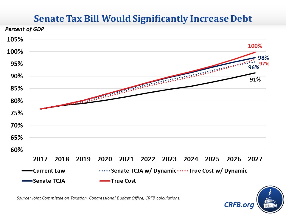 The final Senate version of the Tax Cuts and Jobs Act (TCJA) would cost $1.45 trillion under conventional scoring and over $1 trillion on a dynamic basis, leading debt to rise to between 96 percent and 98 percent of Gross Domestic Product (GDP) by 2027 (compared to 91 percent under current law). However, the bill also includes a number of expirations and late-stage tax hikes meant to reduce the official cost of the bill. These expirations hide $500 billion to $600 billion of potential further costs, which could ultimately increase the cost of the bill to as much as $2 trillion (before interest) on a conventional basis or roughly $1.6 trillion on a dynamic basis. As a result, debt would rise to between 97 percent and 100 percent of GDP by 2027.