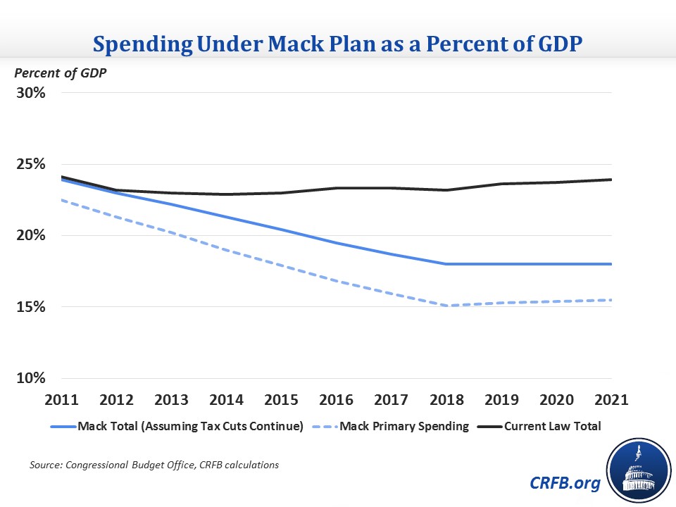 The critical challenge facing lawmakers is to agree to a bipartisan fiscal plan with broad support. Spending caps can be an essential element to controlling future deficits and in attracting bipartisan support (see the Fiscal Commission's plan) and will likely play a part in any final consensus between lawmakers. While Rep. Mack's proposal would certainly reduce deficits and debt, it's unclear if it would be able to garner bipartisan support.