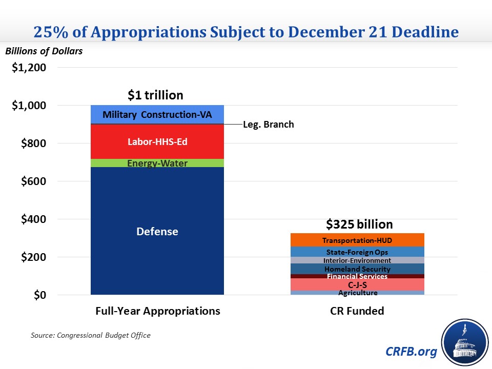 Lawmakers have already passed full-year appropriations for five of the 12 appropriations bills: Defense, Labor-Health and Human Services-Education, Military Construction-Veterans' Affairs, Energy and Water, and the Legislative Branch. The seven remaining appropriations bills are currently being funded through a two-week continuing resolution scheduled to last through Friday.
