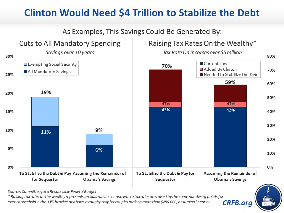 Secretary Clinton should be commended for not only committing to pay for her new initiatives but also for offering serious and specific proposals that would more or less achieve this goal. However, with debt at post-war record-high levels and projected to grow unsustainably, simply remaining on our current course is not enough. Secretary Clinton would need over $4 trillion of deficit reduction to simply replace the sequester and stabilize the debt at its current high levels. So far she has proposed over $1.5 trillion of savings, and yet does not dedicate even a fraction of it to putting the debt on a more sustainable path.