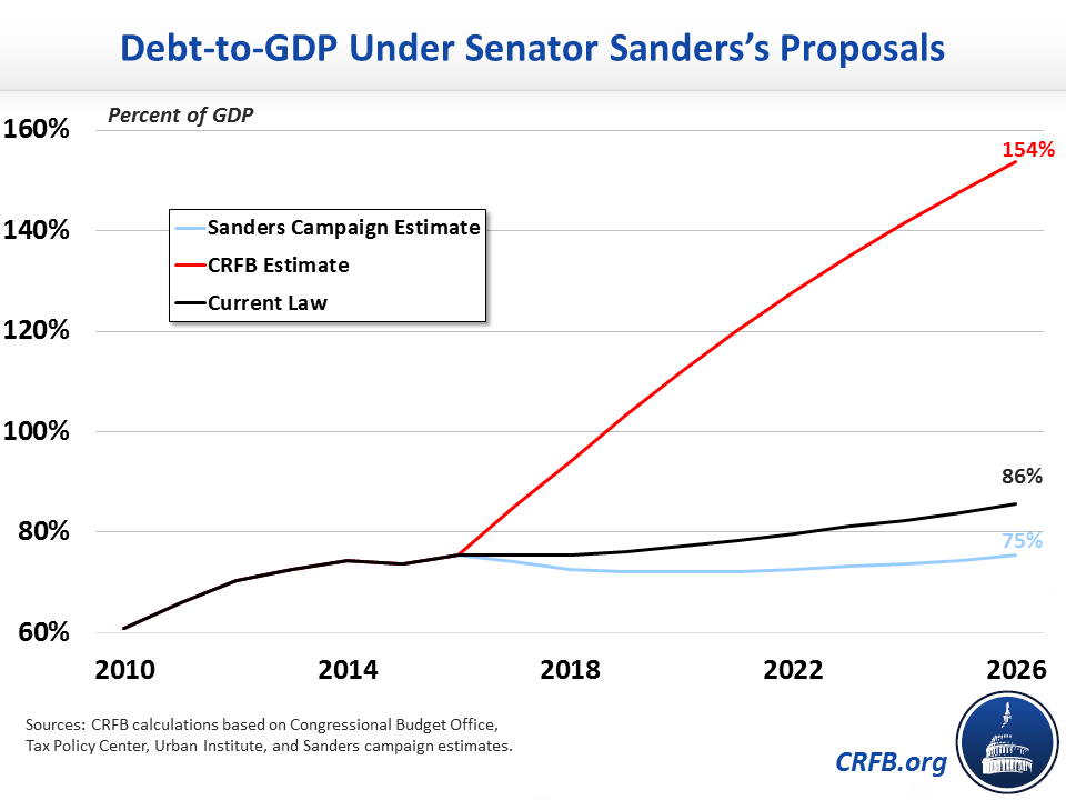 Since the 2016 presidential campaign began, the Committee for a Responsible Federal Budget has analyzed several campaign proposals through our Fiscal FactCheck project. This analysis of Senator Sanders’s policies, originally published on April 7, updated on May 9, and again updated on May 19, 2016, is based on the proposals currently available his website. (Read our analysis of the policies put forth by Secretary Hillary Clinton, Senator Ted Cruz, and Donald Trump.) We aimed to assess all major policy proposals on Senator Sanders’s website (BernieSanders.com) as of May 19, 2016; however, we have excluded several smaller initiatives which, on net, would likely further increase debt modestly. Senator Sanders may also support additional policy changes not listed on his website. As with our other analyses, we shared our estimates with the campaign ahead of time to solicit comments. We intend to follow up with further updates and analyses of the Presidential candidates as more proposals are released. Estimates provided in this analysis are both rough and rounded.