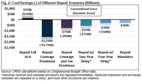 Separating “repeal” from “replace” legislation introduces a number of challenges, many beyond the scope of this paper. From a fiscal perspective, timing issues might be used to obscure the costs or savings; repeal and delay legislation might make it more difficult to pass fiscally responsible replacement legislation.