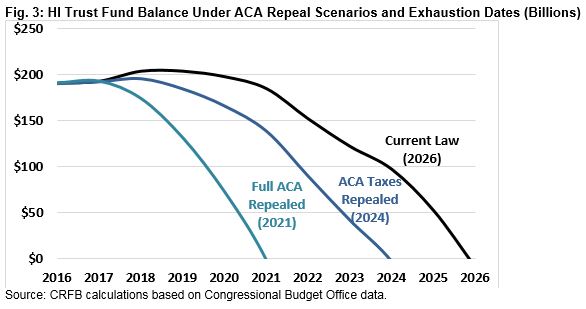 By our estimates, full repeal of the ACA – including the Medicare cuts – would advance the HI insolvency date from 2026 to 2021 and triple its 10-year shortfall. Repealing the coverage and revenue provisions while retaining the Medicare cuts would advance the HI insolvency from 2026 to 2024 and increase the 10-year shortfall by about half.