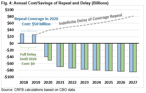 We estimate under an approach like this that a two-year delay would cost roughly $50 billion over two years, while a four-year delay would cost $135 billion over those four years. In this case, the $450 to $600 billion of gross savings in subsequent years would not only have to pay for a replacement, but also cover the cost of repeal in the early years. Adding to near-term deficits for this purpose would be unjustified and unwise. (See “Repeal and Delay Shouldn't Increase Near-Term Deficits“ for more detail.)