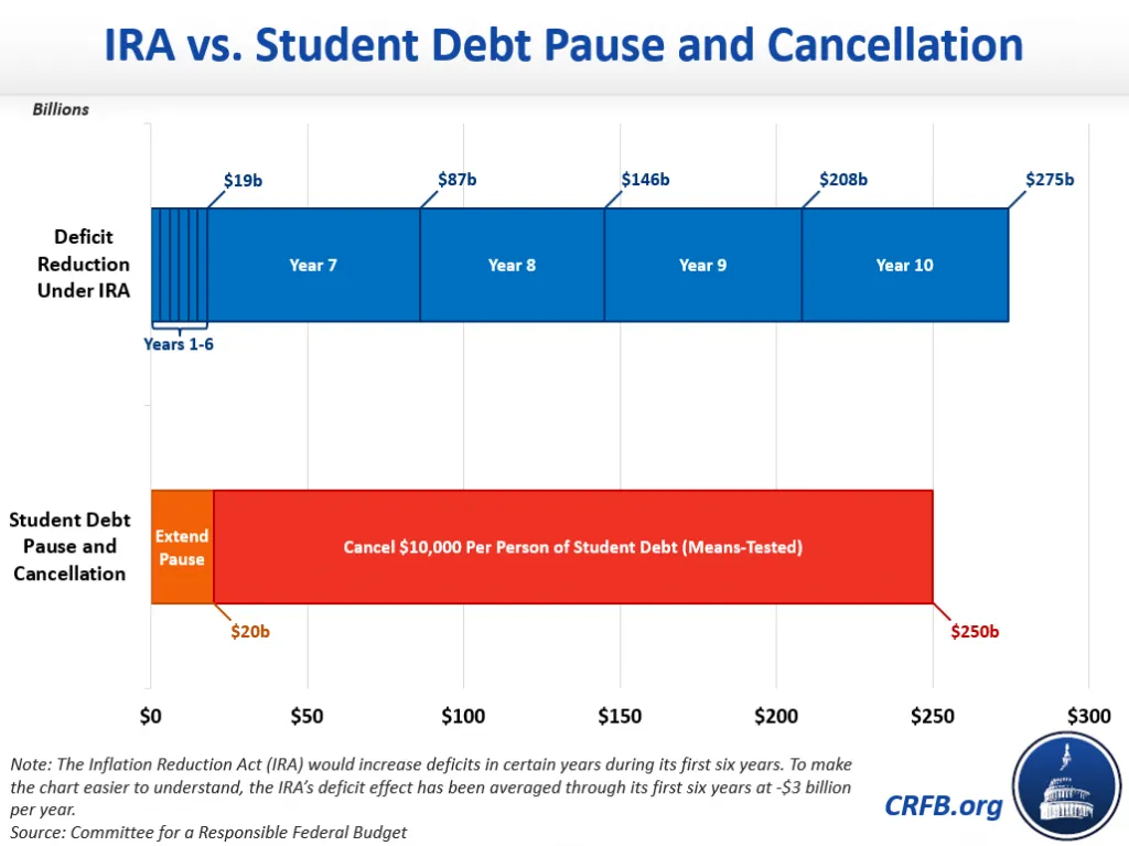 Broad student debt cancellation – whether by extending the pause, forgiving balances, or both – would undermine the benefits of the IRA and demonstrate a lack of seriousness in addressing our nation’s economic challenges.