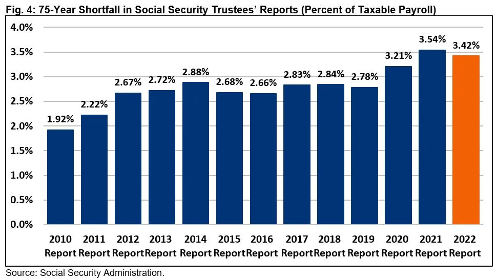 Nevertheless, the Trustees project Social Security faces a 75-year shortfall of 3.4 percent of taxable payroll, which is 78 percent larger than projected in 2010 and means policymakers need to enact substantial revenue or benefit changes, or both, sooner rather than later.