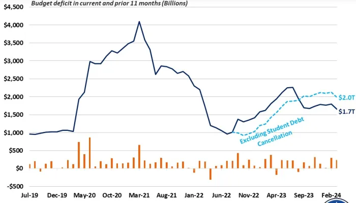 The federal budget deficit totaled $1.7 trillion over the past 12 months, down $142 billion from the 12-month period ending in February and down $37...