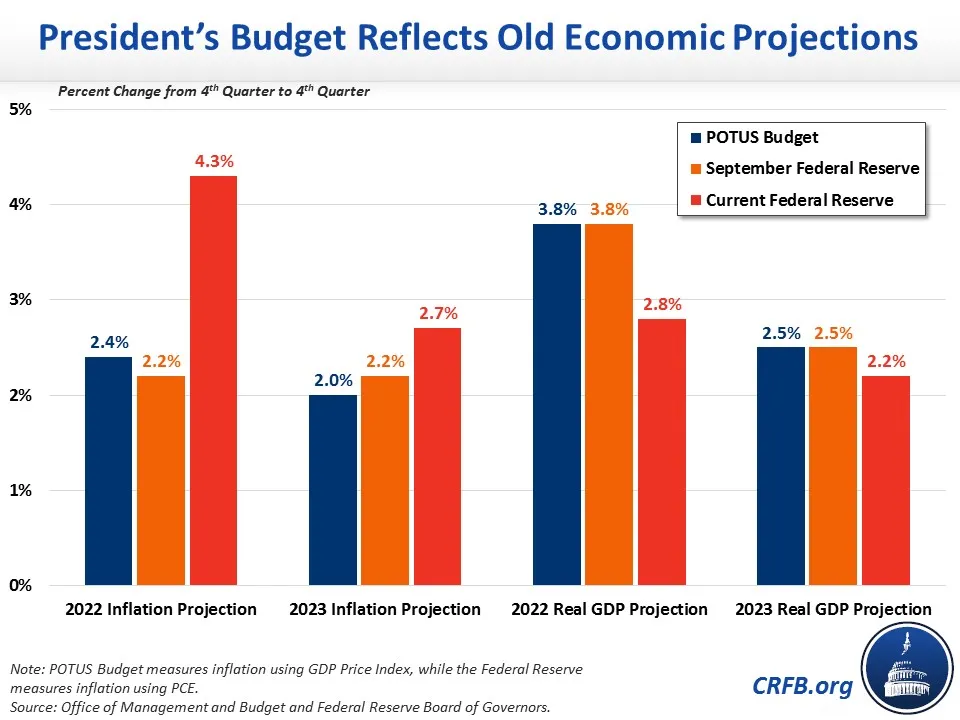 While the President’s budget is due the first Monday of February, this year’s budget was released nearly two months after that deadline. In part because the budget release was so delayed, the economic assumptions within the budget were long out of date by the time of release. The inflation, economic growth, interest rate, and employment assumptions that underlie the budget and its estimates were based mainly on data from October of 2021 – five months before the budget was released.