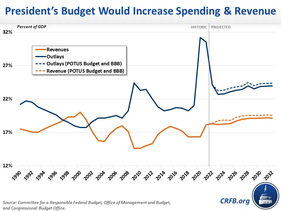 The President’s budget would substantially increase the size of government. Even excluding the effects of Build Back Better, the budget would increase spending by $1.4 trillion and revenue by $2.5 trillion. By the end of the decade, spending would reach 23.9 percent of GDP – the highest in post-war history other than during the global financial crisis and COVID-19 pandemic. Revenue would reach 19.1 percent of GDP, higher than any other year besides 1981 and 1998 through 2000.