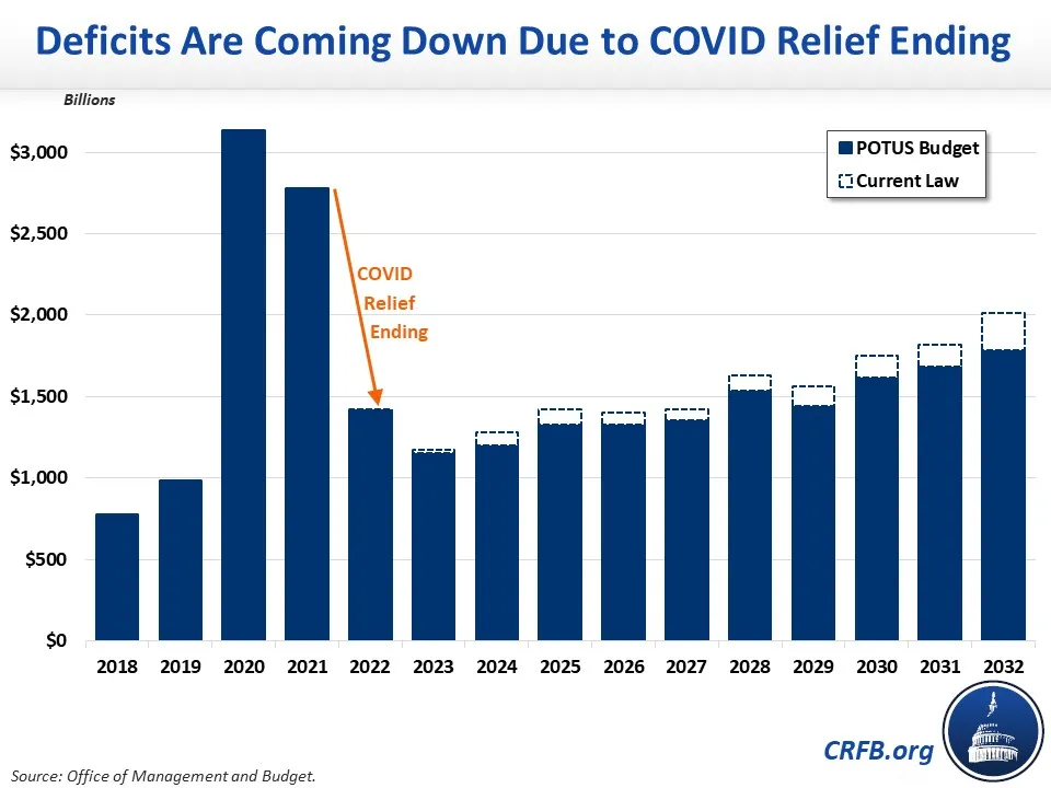 The Administration’s effort to take credit for a decline in the deficit is particularly misleading, given that this is merely the deficit falling from the economy returning to normal and COVID relief coming to an end.