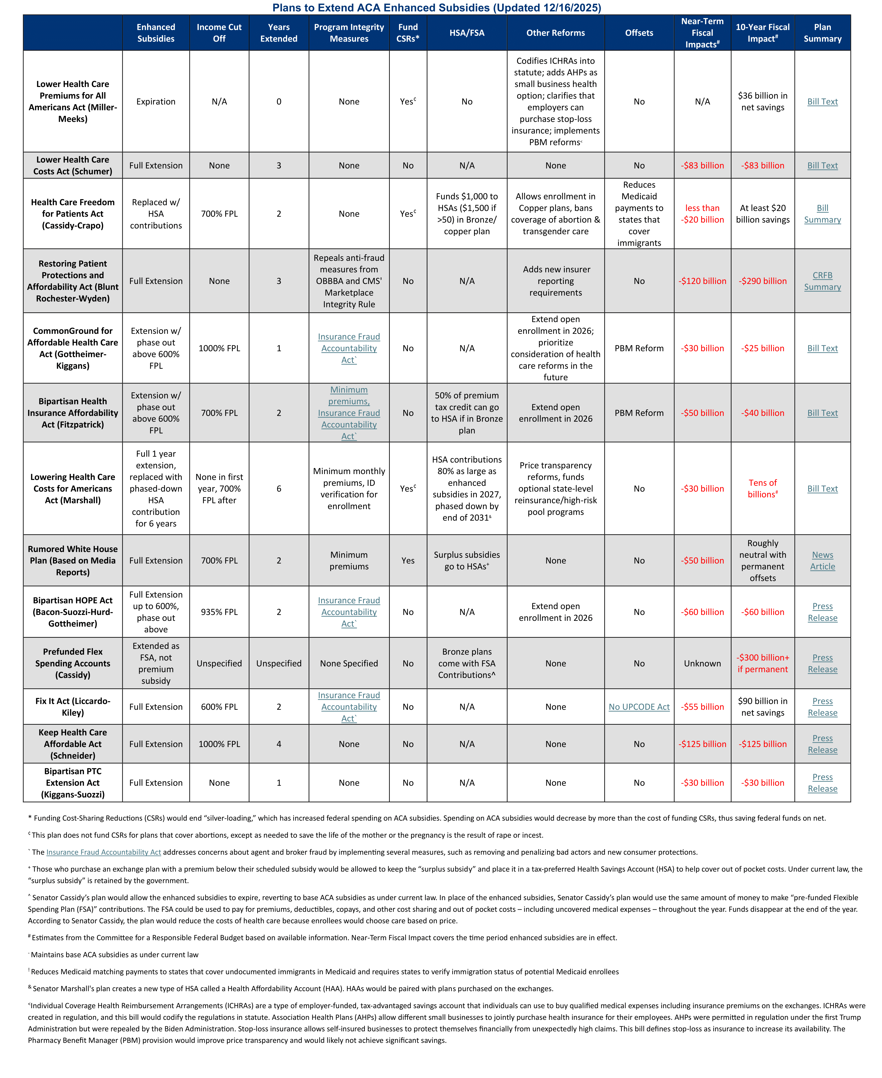 The below table compares the various proposals to extend and/or reform the enhanced subsidies. We will continue to track proposals and add new ones as they arise. We included plans that address the enhanced subsidies proposed by lawmakers, including the White House. We did not include plans that do not speak directly to the enhanced subsidies, such as Senator Rick Scott’s (R-FL) plan.