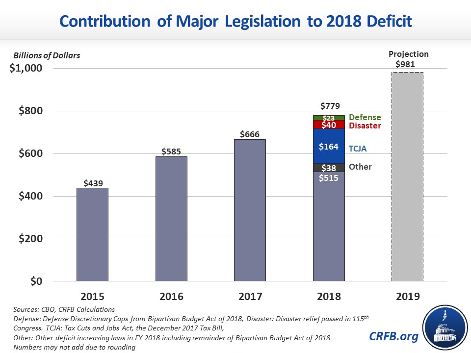 The Treasury recently announced the final deficit for the fiscal year that just ended (FY 2018): $779 billion, up from $666 billion the year before. We recently calculated that over one-third of the 2018 deficit and 234 percent of the increase in deficits – $264 billion – was due to legislation enacted by Congress over the past year. The largest portion was the tax law, estimated to cost $164 billion in FY 2018, followed by the Bipartisan Budget Act of 2018 (BBA18) which was estimated to cost $68 billion in 2018. (Although the spending deal increased the budget caps by roughly $150 billion halfway through the fiscal year, not all of the increased allocation is spent in the first year.) Other legislation added $32 billion to the 2018 deficit, mostly for disaster relief legislation.