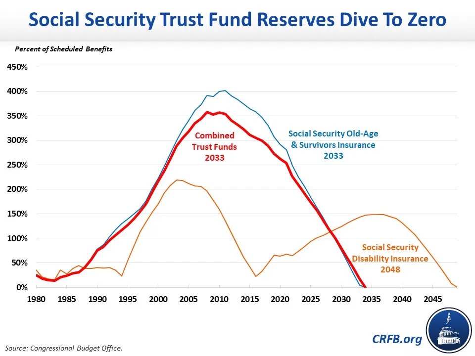 The Congressional Budget Office (CBO) recently released detailed Social Security projections finding that the trust funds are headed for insolvency by 2033 on a theoretically combined basis. Without legislative action, CBO estimates that benefits would be automatically cut by 23 percent across the board upon insolvency.