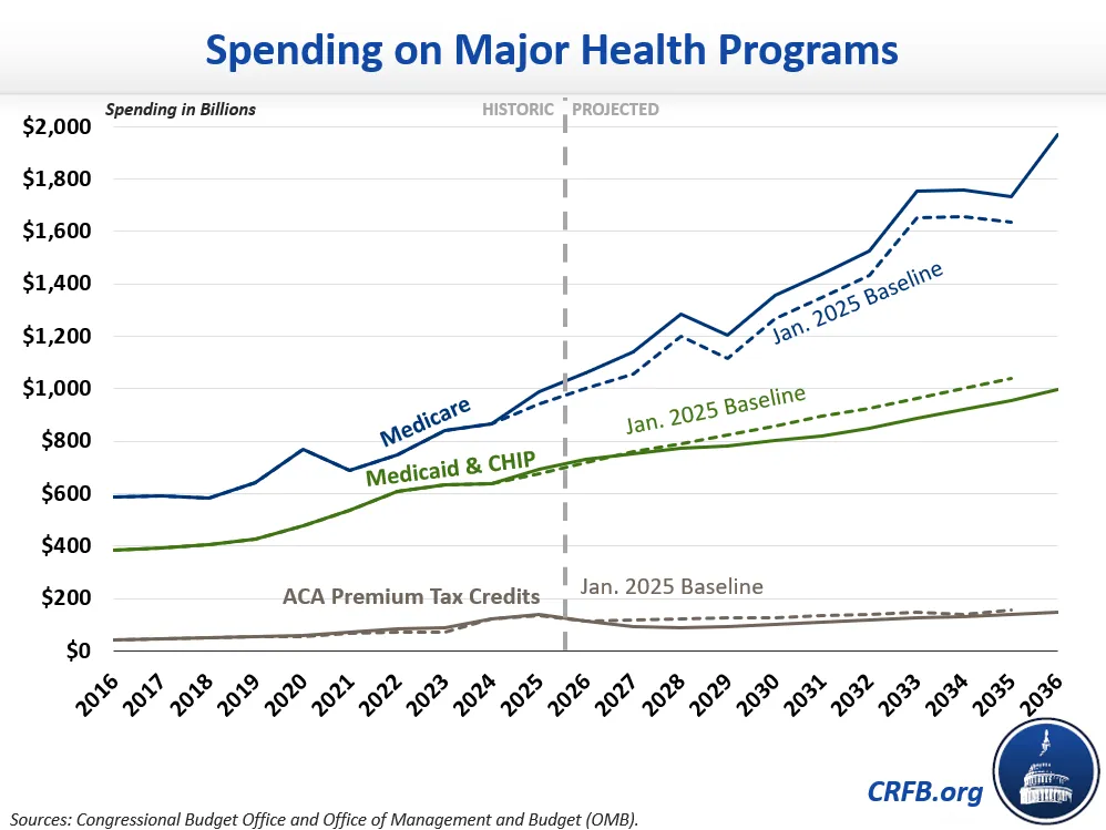 - Medicare’s Hospital Insurance trust fund will be depleted by 2040, 12 years sooner than previously projected, thanks in part to revenue loss from OBBBA.