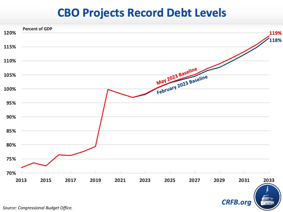 The Congressional Budget Office (CBO) today released new ten-year budget projections, again confirming that the national debt is on an unsustainable path. CBO's new projections update its February baseline and find that debt will reach a record 119 percent of Gross Domestic Product (GDP) by the end of Fiscal Year (FY) 2033 and deficits will total $20.3 trillion (6.1 percent of GDP) over the next decade.