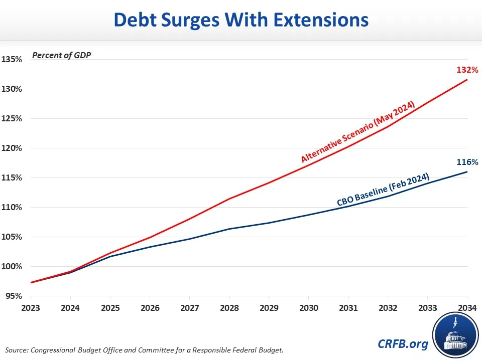Based on new estimates from the Congressional Budget Office (CBO), debt could reach 132 percent of Gross Domestic Product (GDP) by Fiscal Year (FY) 2034 under an alternative scenario where discretionary spending grows with the economy and expiring provisions, such as those from the Tax Cuts and Jobs Act (TCJA), are extended. Under this alternative scenario, deficits would reach 8.6 percent of GDP by 2034 and interest costs would reach 4.4 percent of GDP.