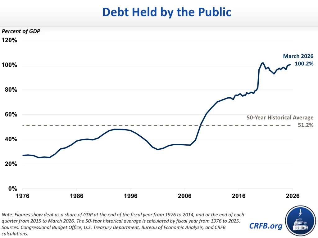 Incorporating BEA’s preliminary Gross Domestic Product (GDP) estimate for the first quarter of 2026, GDP totaled $31.22 trillion between April of 2025 and March of 2026. Debt held by the public was $31.27 trillion at the end of the quarter, or 100.2% of GDP.