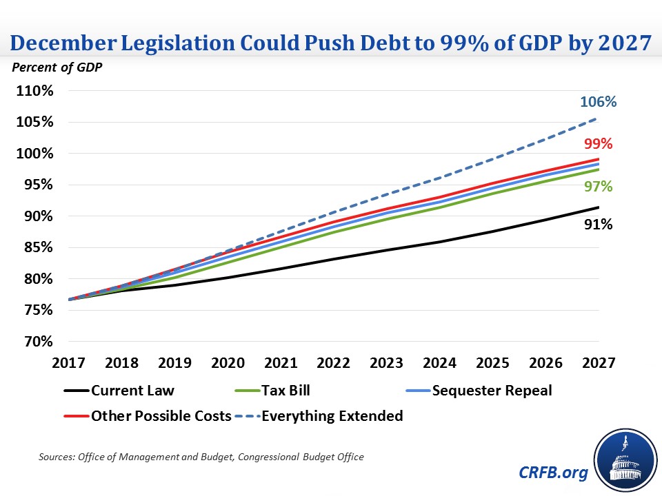 If policymakers adopt only the Senate tax bill without offsets, that alone would be enough to increase debt held by the public to 97 percent of Gross Domestic Product (GDP) by 2027 (debt would exceed the size of the economy two years later). Unpaid-for sequester relief and other policies above would be enough to increase that debt ratio to 99 percent of GDP in 2027. Assuming all these temporary policies were further extended in future years,* debt would reach the all-time record of 106 percent of GDP by 2027.