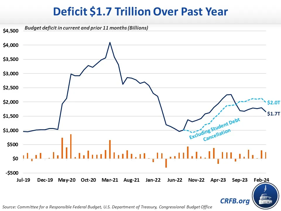 The federal budget deficit totaled $1.7 trillion over the past 12 months, down $142 billion from the 12-month period ending in February and down $37 billion from the Fiscal Year (FY) 2023 deficit of $1.7 trillion. The deficit in March 2024 was $236 billion, compared to $378 billion last March – lower partly due to timing shifts. The following is an updated analysis of the rolling deficit, incorporating the latest data from the Congressional Budget Office (CBO). Removing the effects of student debt cancellation, which was ruled illegal, the rolling deficit was $2.0 trillion. As a share of the economy, the deficit was roughly 6.0 percent of Gross Domestic Product (GDP), or 7.2 percent excluding student debt effects.