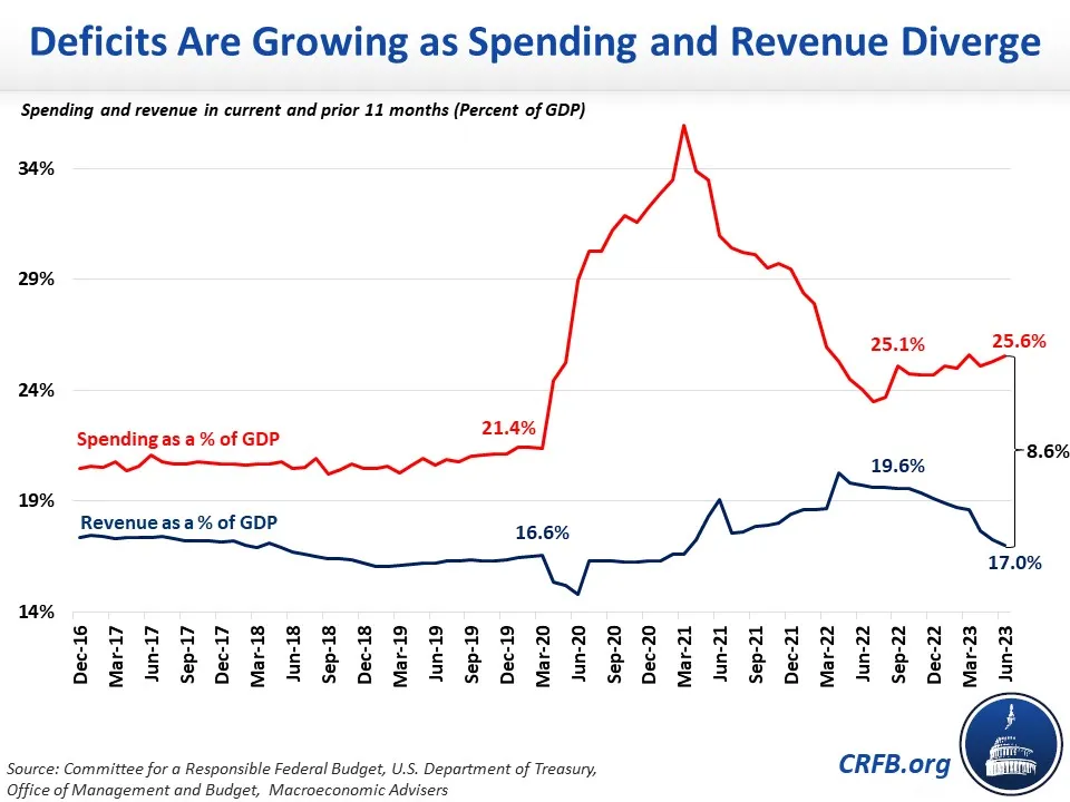 Meanwhile, the recent temporary revenue surge has ended, with revenue falling from a near-record 19.6 percent of GDP in FY 2022 down to 17.0 percent of GDP over the past 12 months – below the 50-year historic average of 17.4 percent and below what the Congressional Budget Office projected it would be back in 2018.
