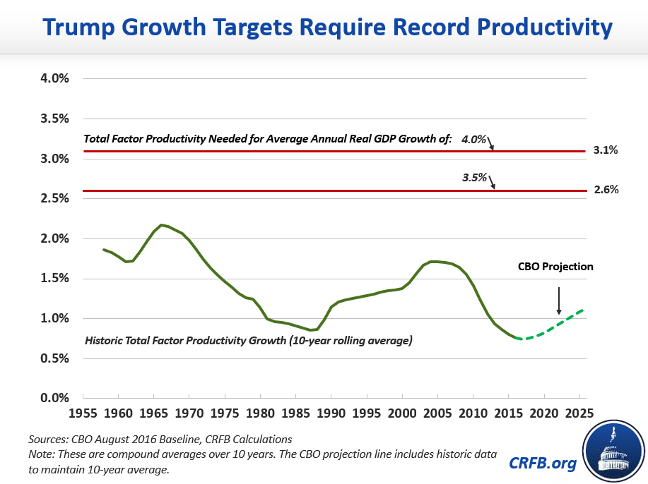 During the campaign, President-elect Trump frequently claimed his policies would grow the economy by 4 percent per year, also mentioning growth targets between 3.5 and 6 percent. Unfortunately, this level of growth is nearly impossible to achieve over a sustained period, absent transformative factors outside the government's control. With today's aging population, sustaining just 3.5 percent growth would require productivity to grow at a constant rate that has never been achieved in modern history.