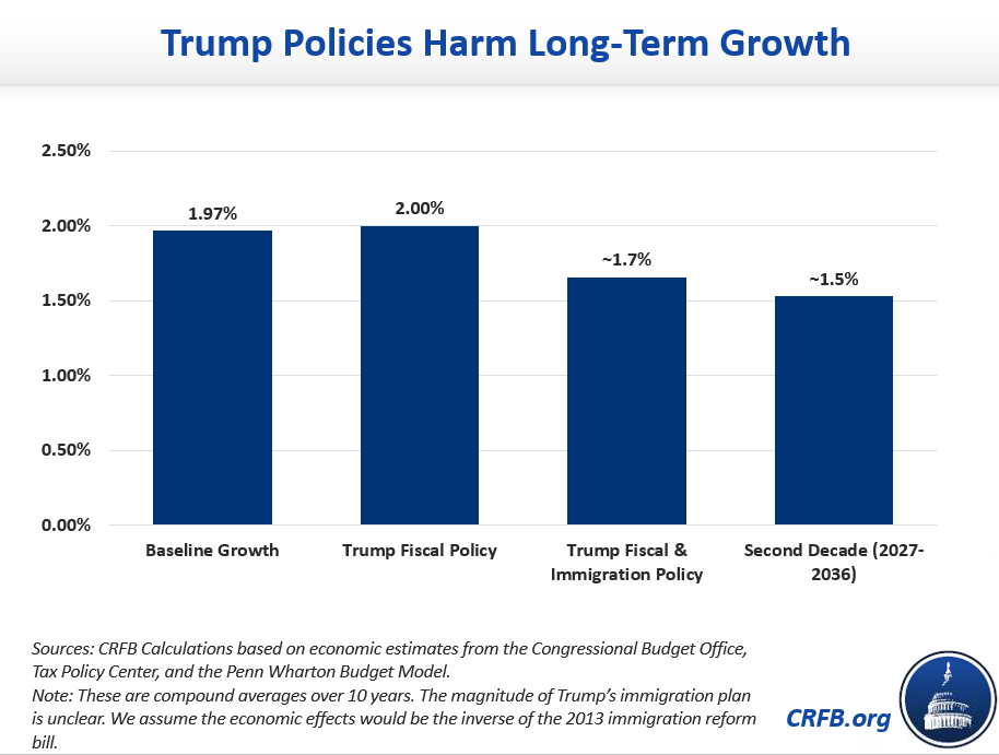 When immigration changes are also included, we estimate Trump's plans would actually slow economic growth to less than 1.7 percent per year. And over the longer term (the second decade), growth could slow to just over 1.5 percent per year.