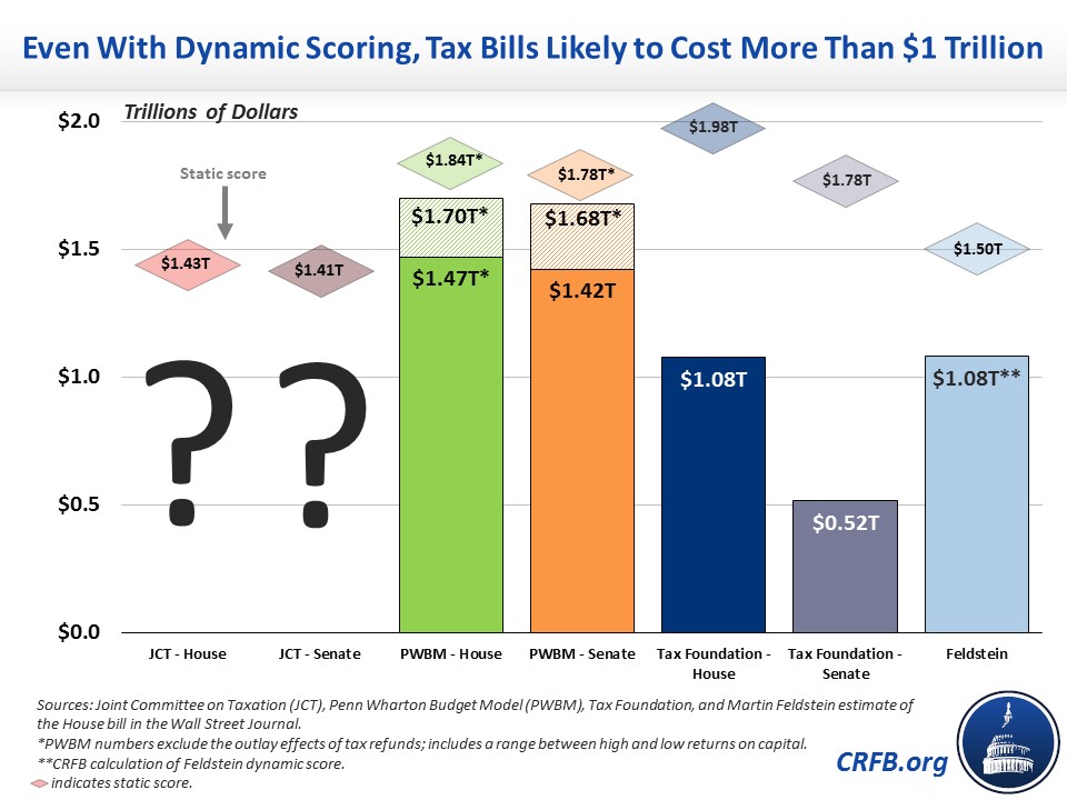 Other higher dynamic estimates of the Senate and House bills from the Tax Foundation – which ignore the economic cost of higher debt – still show that both bills would add significantly to deficits despite their economic growth effects. And a rough estimate of the House bill from former Chairman of the Council of Economic Advisers Martin Feldstein also implies significant new debt.