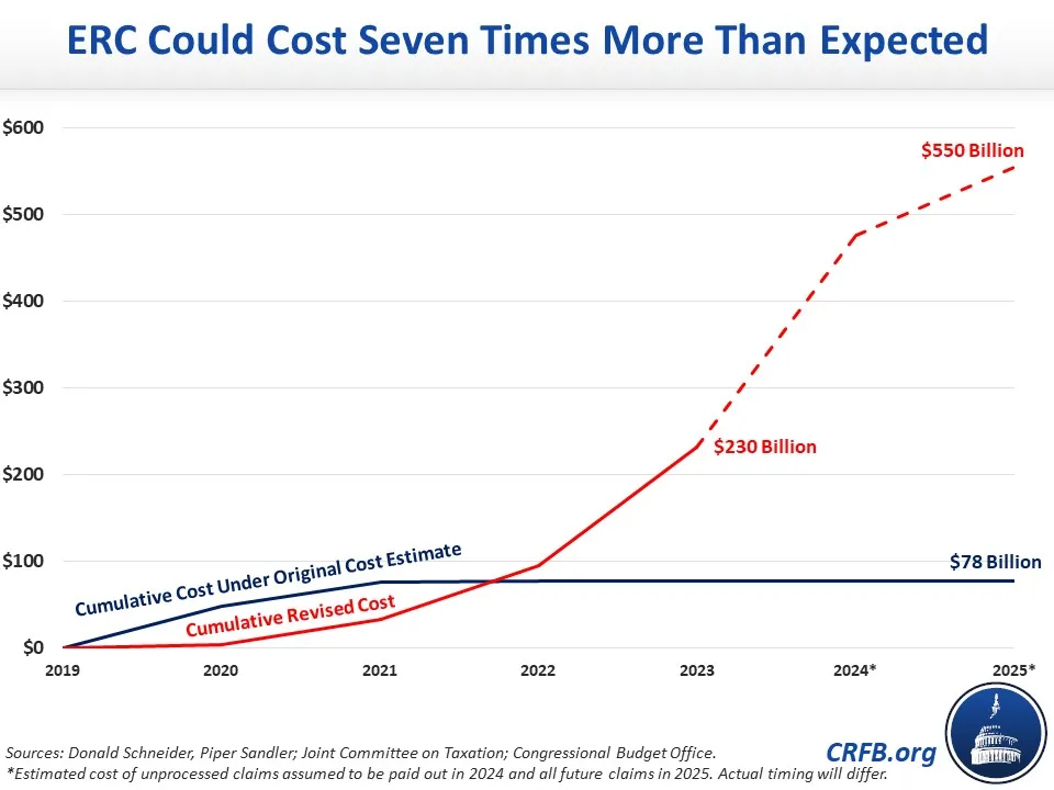 Using data from the IRS and elsewhere, Donald Schneider of Piper Sandler has estimated the ERC added around $230 billion to the deficit through FY 2023 and will cost over $550 billion in total if action isn’t taken to prevent further applications. This includes $240 billion still being processed and another $70 billion of further applications that would continue through April of 2025.