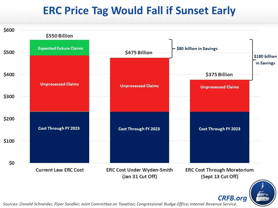The recently proposed bipartisan Tax Relief for American Families and Workers Act of 2024 (Wyden-Smith) would reduce the cost of the ERC by $79 billion. This would come mostly from cutting off new applications for the credit on January 31, 2024, rather than the current end date of April 15, 2025. Additional savings would come from reducing fraudulent claims, including an increase in financial penalties on promoters for aiding and abetting in tax fraud and an increase in disclosure requirements.