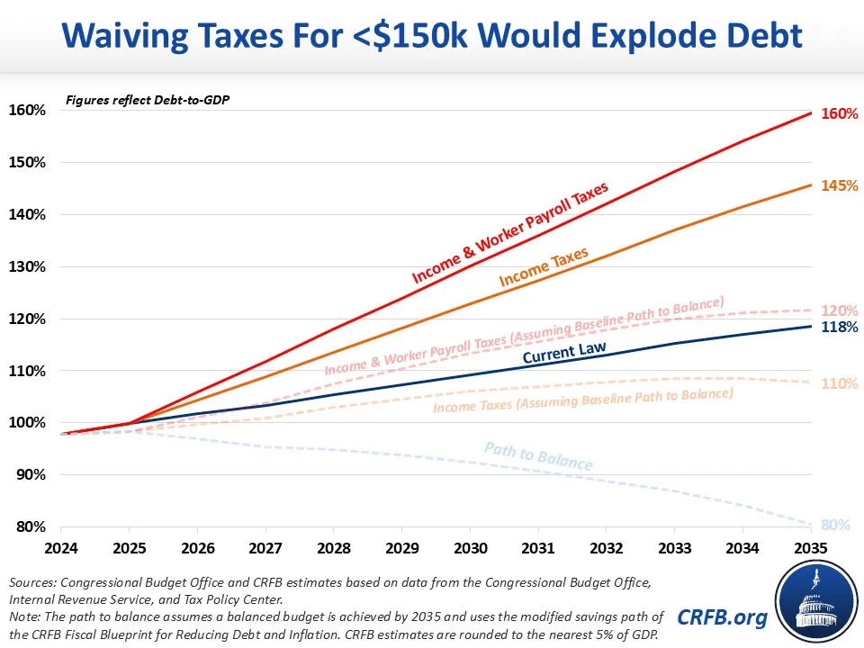 Members of the Trump Administration and Congress have recently discussed the idea of waiving all taxes for those making less than $150,000 per year, possibly after the budget is brought into balance. Even if enacted in a targeted manner, we estimate such a change would reduce revenue by roughly $10 trillion through 2035 if applied to income taxes only and $15 trillion if applied to employee-side payroll taxes as well. This would boost debt to between 145 and 160 percent of Gross Domestic Product (GDP) by 2035, up from 118 percent under current law.