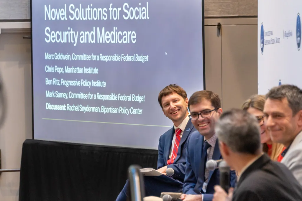 The first panel, “Novel Solutions for Social Security and Medicare,” was moderated by Rachel Snyderman of the Bipartisan Policy Center and featured Marc Goldwein and Mark Sarney of the Committee for a Responsible Federal Budget, Chris Pope of the Manhattan Institute, and Ben Ritz of the Progressive Policy Institute. Goldwein and Sarney discussed the Committee’s first two Trust Fund Solutions – the Employer Compensation Tax and a Social Security COLA cap – while Ritz and Pope discussed their proposals to reform Social Security and Medicare, respectively.