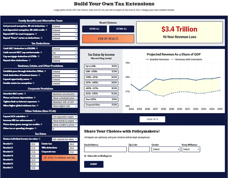 The event concluded with a lively reception during which attendees were able to design their own plan for addressing the 2025 TCJA expirations with the new Build Your Own Tax Extensions tool. The tool allows users to extend, expire, or modify different elements of the TCJA as well as customize tax rates. While a full extension of the TCJA could cost $3.4 trillion or more, we hope this tool will foster thoughtful conversations and fiscally responsible plans well in advance of the December 2025 deadline.