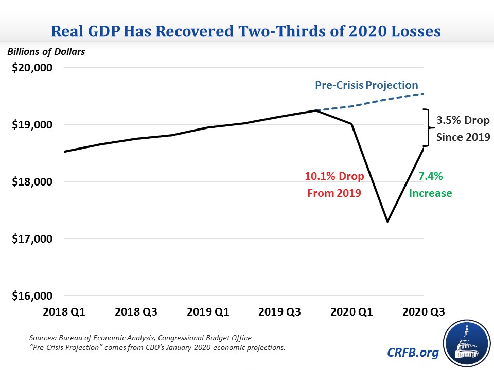 In total, GDP remains 3.5 percent below where it was at the end of 2019 and 4.9 percent below where it otherwise might have been. This is a substantial improvement from the second quarter. In fact, the 7.4 percent growth is easily the highest quarterly rate on record going back to 1947, nearly doubling the previous record of 3.9 percent in the first quarter of 1950. Yet the economy remains far from fully recovered and is unlikely to fully recover until the public health situation is under control. In the meanwhile, well-designed fiscal policy could help to speed the pace of recovery.