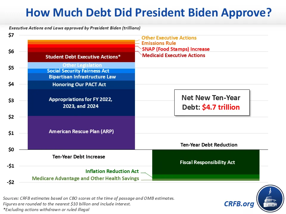 Over the four years of President Biden’s term – from January 2021 through January 2025 – we estimate that he approved $4.7 trillion in new ten-year debt through legislation and executive actions.