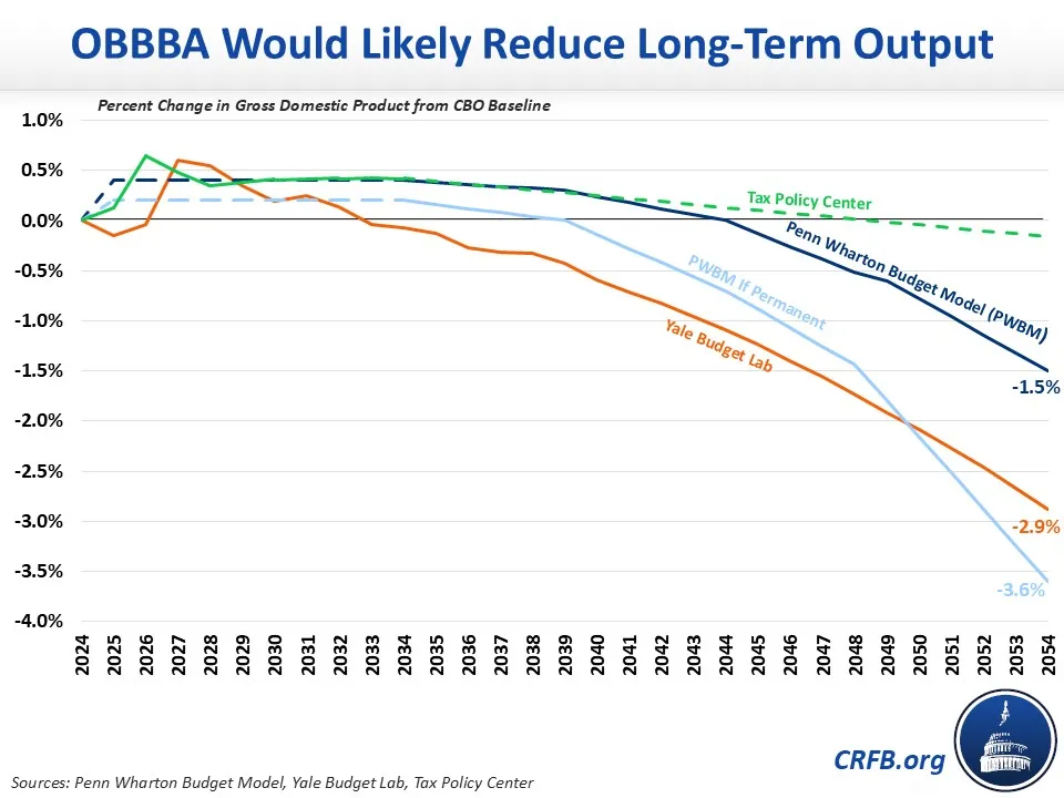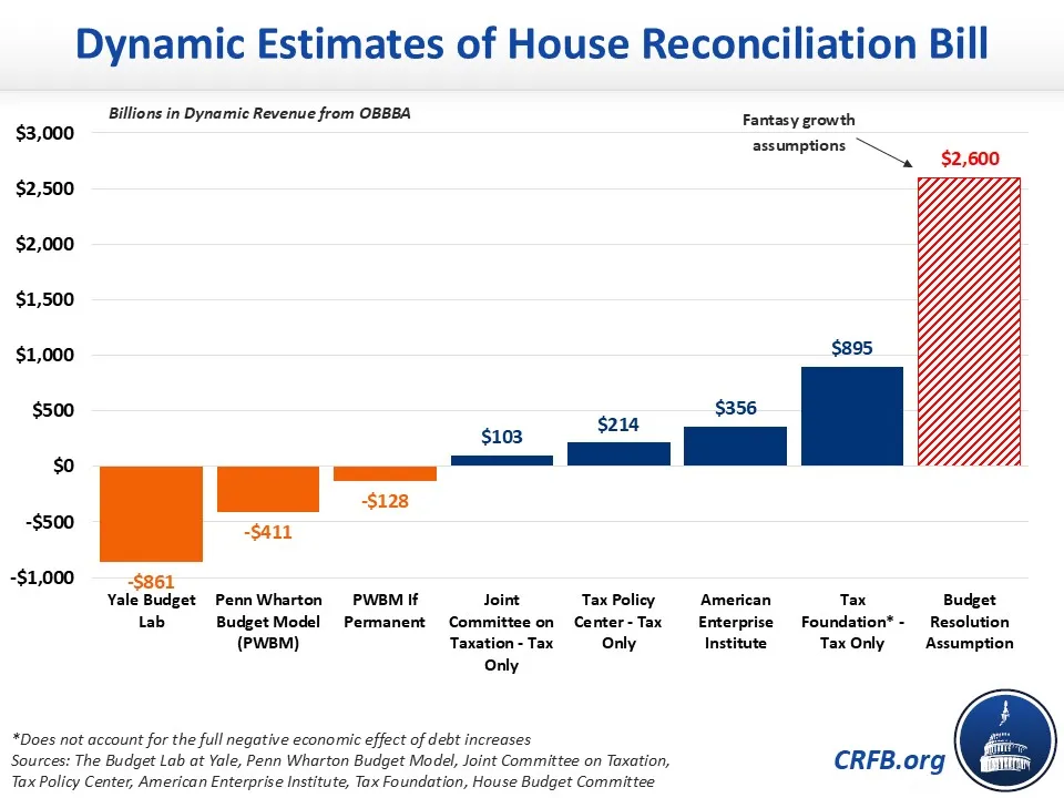 So far, the Joint Committee on Taxation (JCT), the Tax Foundation (TF), the Budget Lab at Yale (YBL), the Penn Wharton Budget Model (PWBM) Kyle Pomerleau of the American Enterprise Institute (AEI) and the Tax Policy Center (TPC) have all produced dynamic analyses of OBBBA. Importantly, these modelers have evaluated different parts of the bill in different ways – for example, JCT and TPC only look at the tax title, TF ignores the negative effects of higher debt, and PWBM evaluates the bill as written and if temporary provisions were made permanent. All reach different conclusions, but all recognize the OBBBA has a combination of pro-growth and anti-growth provisions and would not massively change the annual growth rate or generate enough revenue to "pay for itself." In fact, OBBBA may add more to the debt on a dynamic basis than on a conventional basis, as higher debt pushes up interest rates and costs.